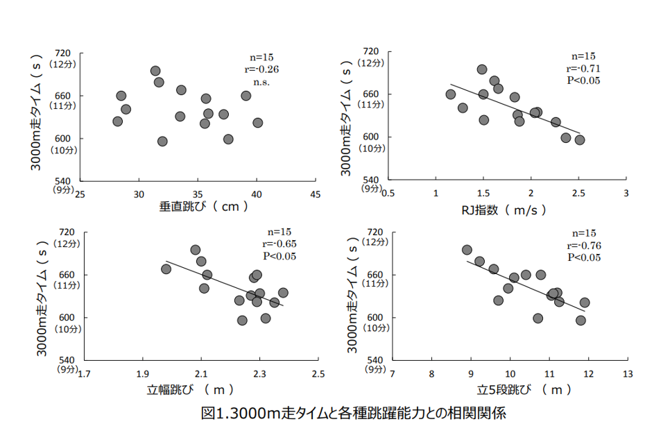受賞対象となった論文「思春期の長距離走選手における3000m走能力と4種類の跳躍能力との関係」(ランニング学研究 31巻:1-8)では、中学生や高校生の長距離選手におけるプライオメトリックトレーニング(跳躍力・瞬発力を高めるトレーニング)の重要性を示しました。中学生や高校生の長距離走選手に対して、跳躍トレーニングを効果的に実施するための知見を得ることを目的に、長距離走能力と4種類(リバウンドジャンプ、垂直跳び、立ち幅跳び、立ち五段跳び)の跳躍能力との関係性を検討。その結果、長距離走能力と水平方向への連続跳躍能力(立ち5段跳び)が強く関係することが分かりました。