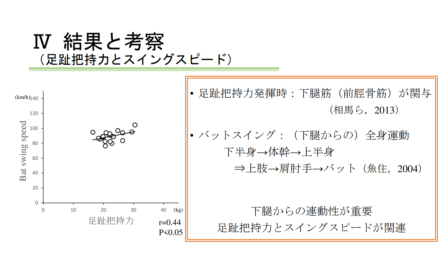 1)足趾把持力とスイングスピード間においては有意な正の相関を認めた(r=0.44, p<0.05).
