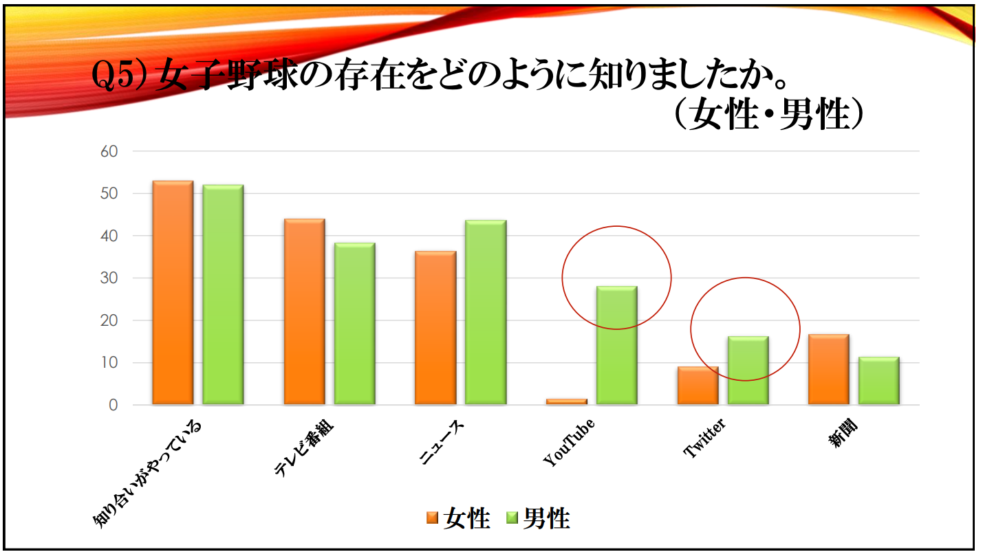 本研究の結果、男性女性、経験者未経験者では認知度、興味についてはそれほど大きな差は出なかったが、女子野球を知ったきっかけや女子野球について知っていることについては男性、経験者と女性、未経験者の間で大きな差があることが明らかになった。