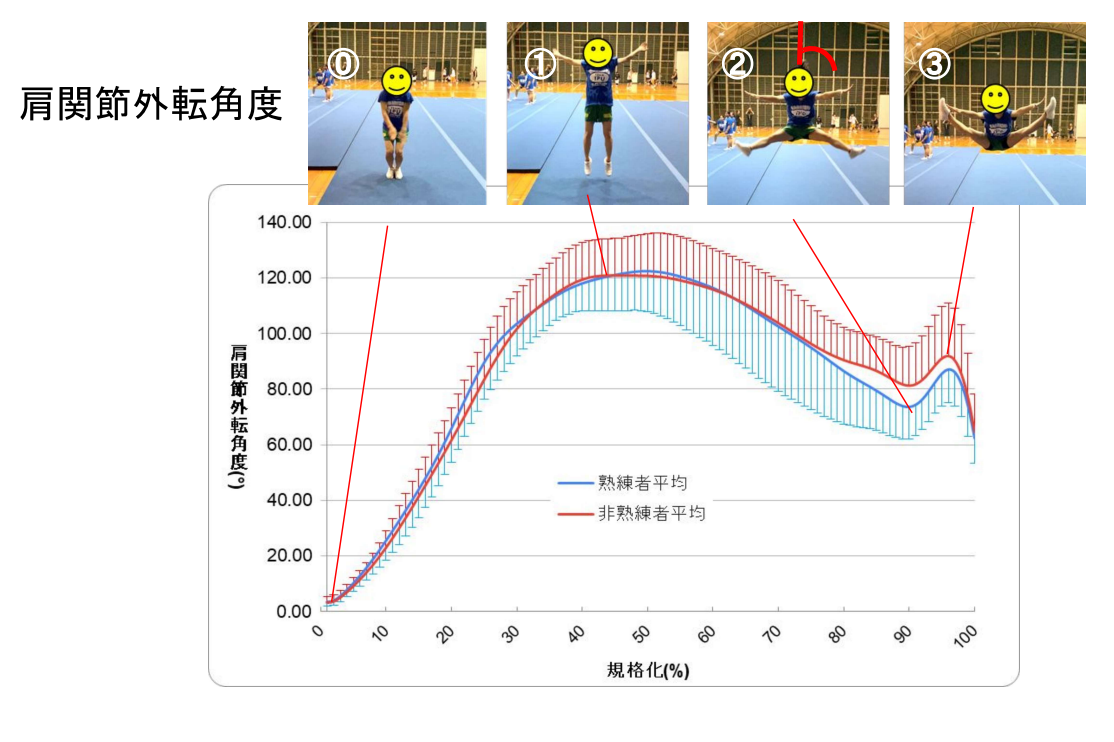 その結果、熟練者は非熟練者を比較すると、股関節外転角度の最大値が大きく、肩関節外転角度の変化が大きかった。このことから、トウタッチジャンプ中、脚を高く上げるためには、最終局面にて再び腕の振り上げが影響することが考察された。