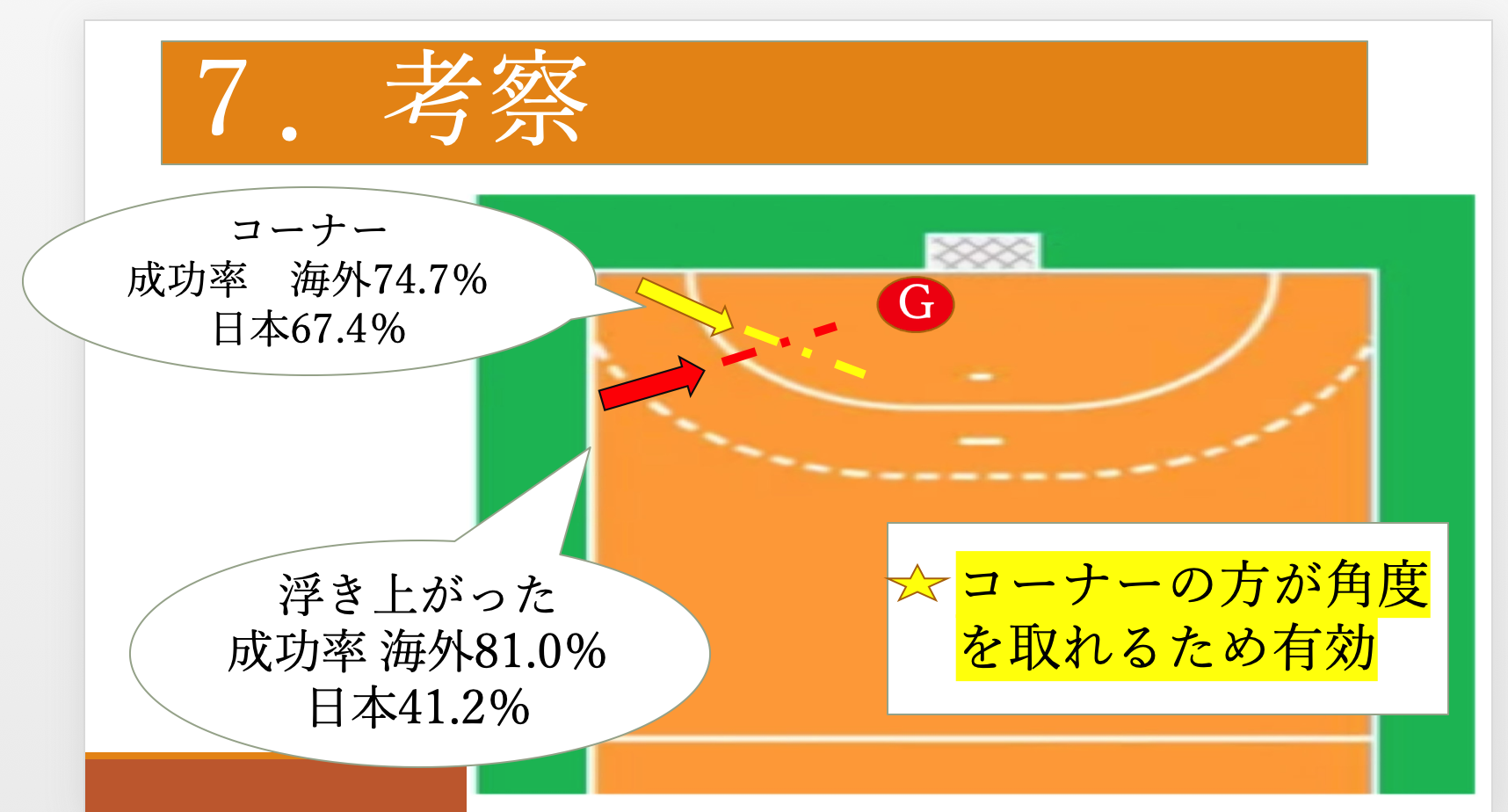 2・3歩の生起率が高く,海外に比べて歩数を使用し,踏み切ることが明らかになった。その理由として,中に跳ぶこと,自身の体勢を保ちシュートを打つことを狙いとしていることが考えられる。