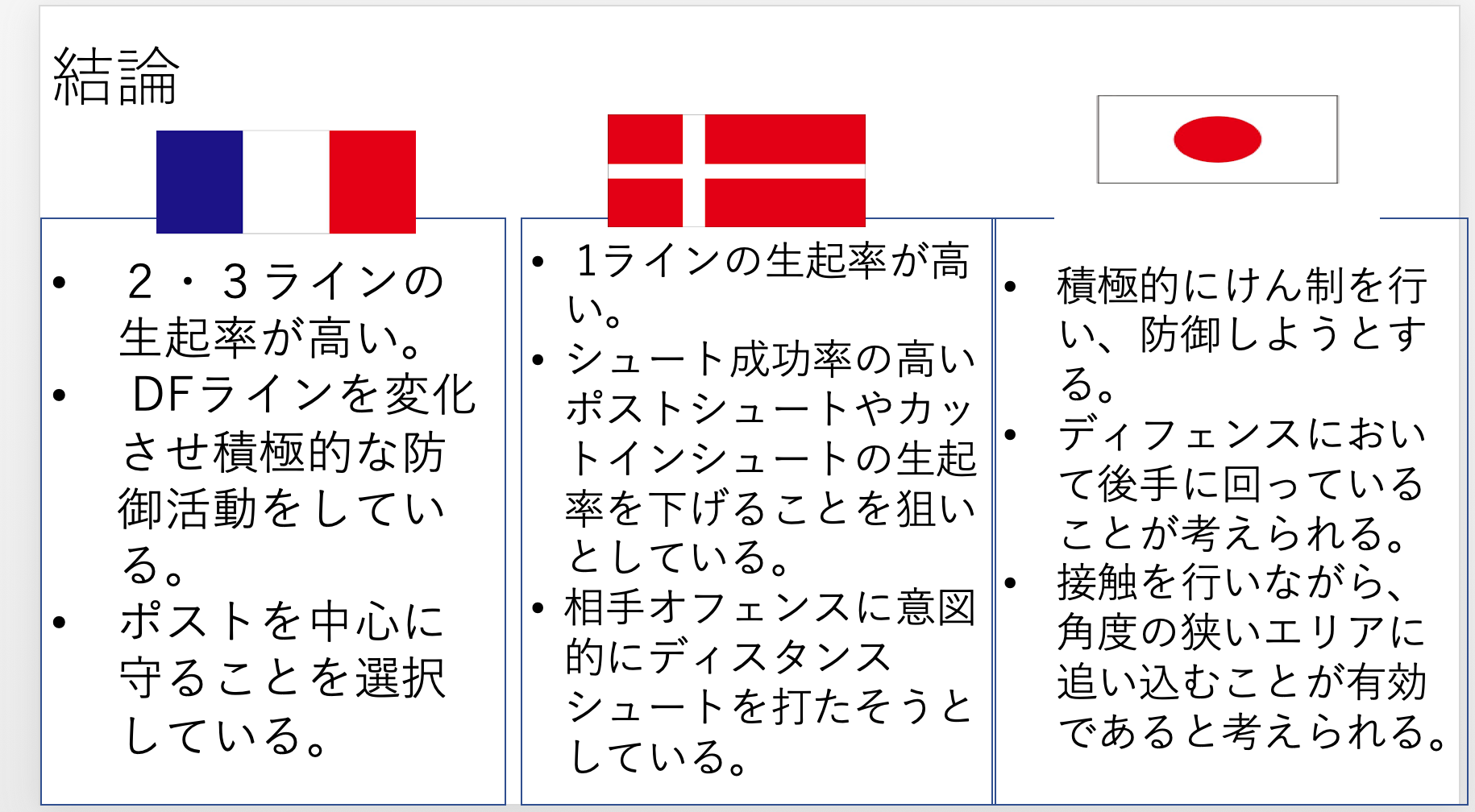 本研究の目的は,ハンドボール強豪国であるフランスおよびデンマーク,我が国日本のディフェンスの失点に着目し,その特徴を明らかにすることを目的とした(対象試合:計22試合)。