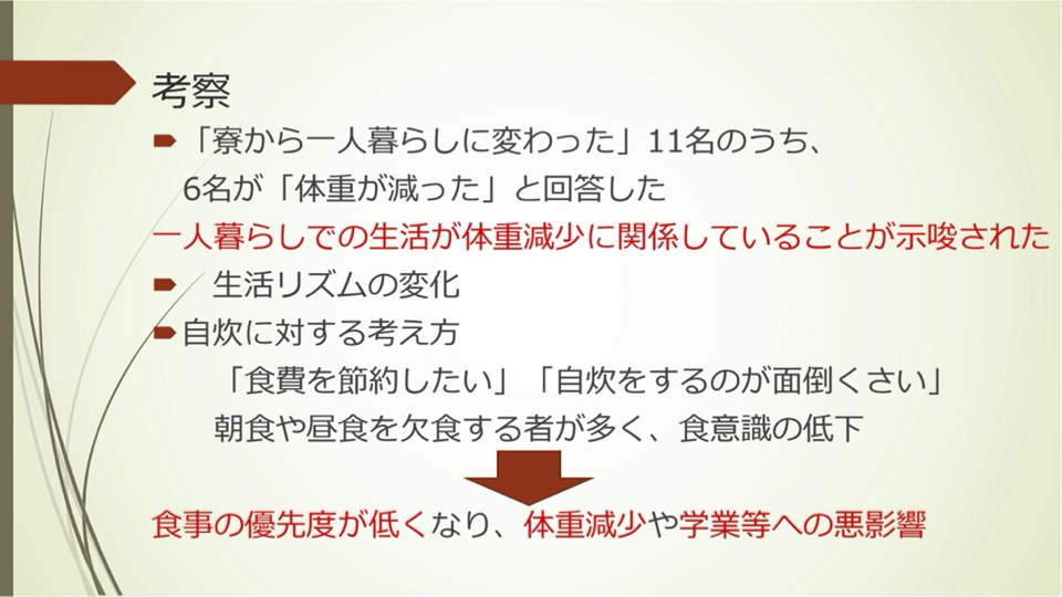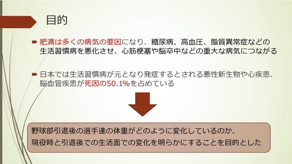 「大学野球部の部活動引退後の体重変化と食意識について」というテーマで研究を進めました。