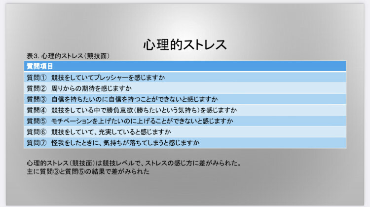 その結果、柔道の競技力とマネジメント力に高い相互関係があることがわかった。競技力の高い選手とそうでない選手は身体的ストレスには大きな差は感じられないが、心理的ストレスには差があることがわかった。さらに、対処法でも同じ対処法を行っていても、競技力の高い選手は、柔道を楽しむ気持ちを忘れずにストレスと感じる部分でも楽しさに変えて対処しているのではないかと言える。