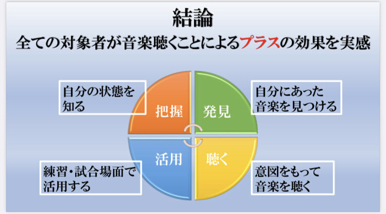 その結果、競技レベル別による大きな差が見られないということは、自分の状態を知るという「把握」、自分にあった音楽を見つけるという「発見」、発見した音楽を意図を持って「聴く」ということ、それを練習場面や試合場面で「活用」するという4つを繰り返すことがパフォーマンス向上に有効であるといえる。つまり、日常的に音楽を聴く狙いと、その効用を意識した聴き方は「音楽を聴く=求める状態になる」といった音楽のルーティン化につながるという結論に至った。