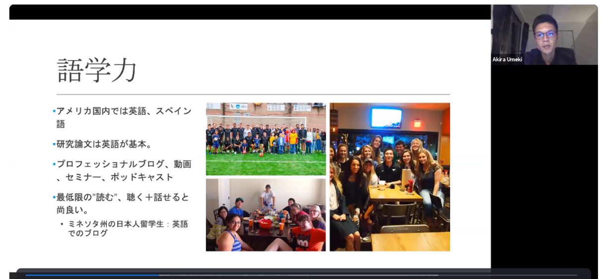 「とても刺激的な話でした。 目的はなんであれ海外へ行くことは何かしら得るものがたくさんあるのではないかという夢を抱いていた中で今回梅木さんの話を聞くことができたことは自分にとってターニングポイントになるのではないかと思います。 プロのサッカー選手を目指し、それを最後まで試した結果、次は何しようと思っていたときにトレーナー業と出会い、そこから極めていかれた梅木さん、根本的にやりたいことが見つかっていない自分は〜すべきという考え方で動いているところがありまして、もっといろんなものに触れる必要があるなと思えたのも今回の講義です。現在とてもワクワクしています。 今回も自分にとってモチベーションとなる講義を計画してくださりありがとうございました。」