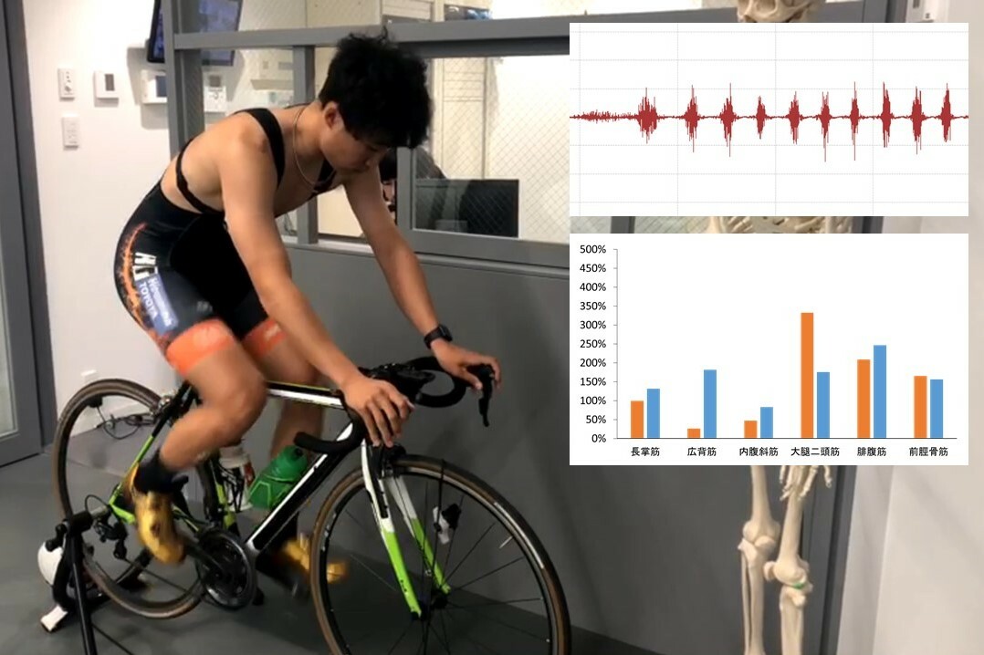 その結果は、固定ローラーでの走行では、ハムストリングスを構成する大腿二頭筋の活動が実走行より極めて高い活動を示した一方、上半身の非常に大きな筋である広背筋はほとんど活動していないことを示していました。上半身も使ったダイナミックなペダリングで好成績を収めてきた白川君にとって、上半身の筋を動員できない固定ローラーでの走行ではトレーニングで鍛えてきた筋をフルに使いきれなかったことがヴァーチャルレースで成績を残せない要因であることが分かりました。