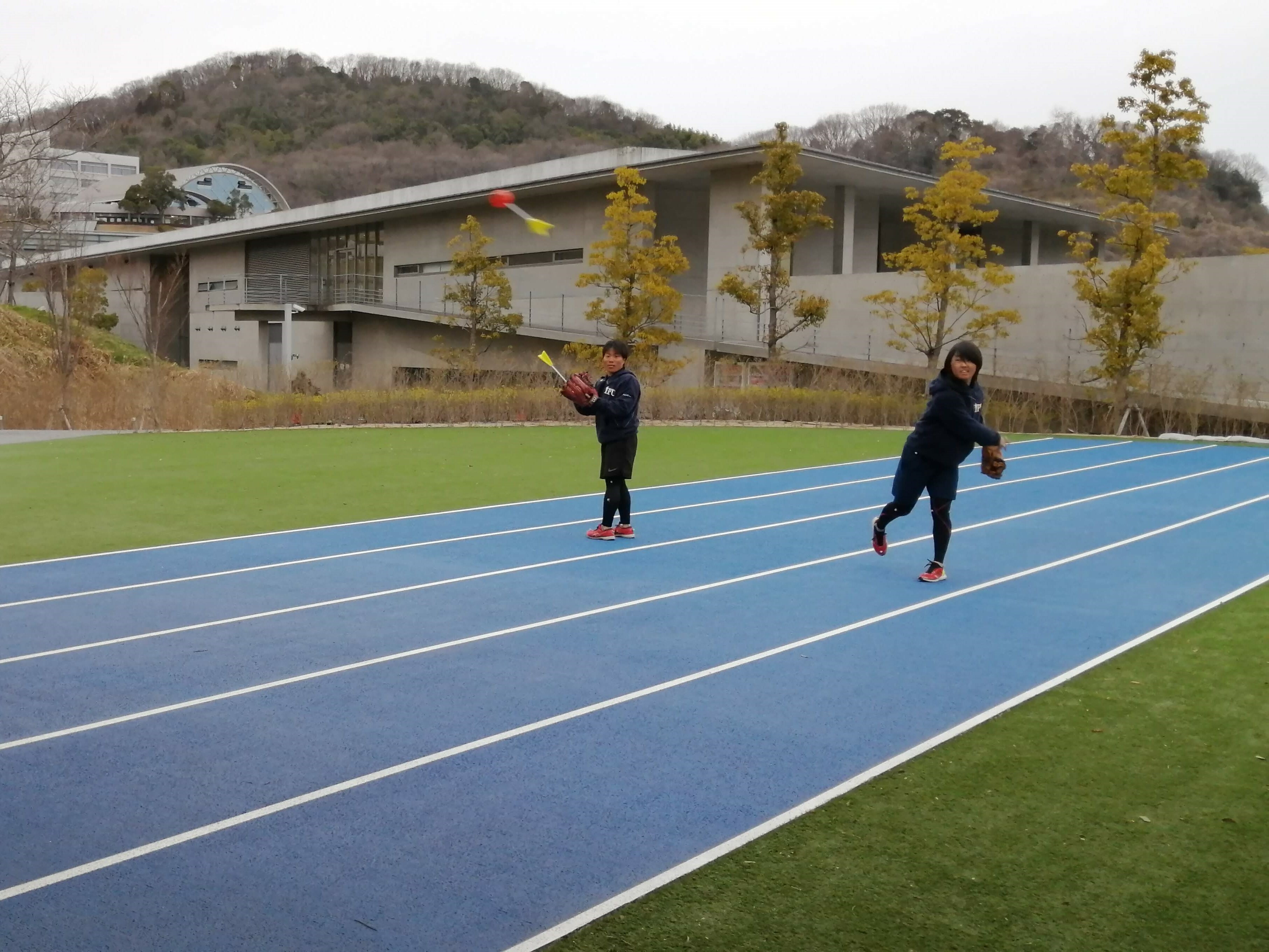 今回の実験では、女子硬式野球部に所属する4名の学生を対象に、キレダスを用いた1回の練習が投球動作、球速および回転数にどのような影響を及ぼすかが検証されました。この日は、キレダスの開発者でもある津口様(株式会社スマイルプランナー)も来学され、学生たちに直々に使用方法をレクチャー、自分の投球動作を改善できるチャンスとあって、学生たちも高いモチベーションでこの実験に挑みました。