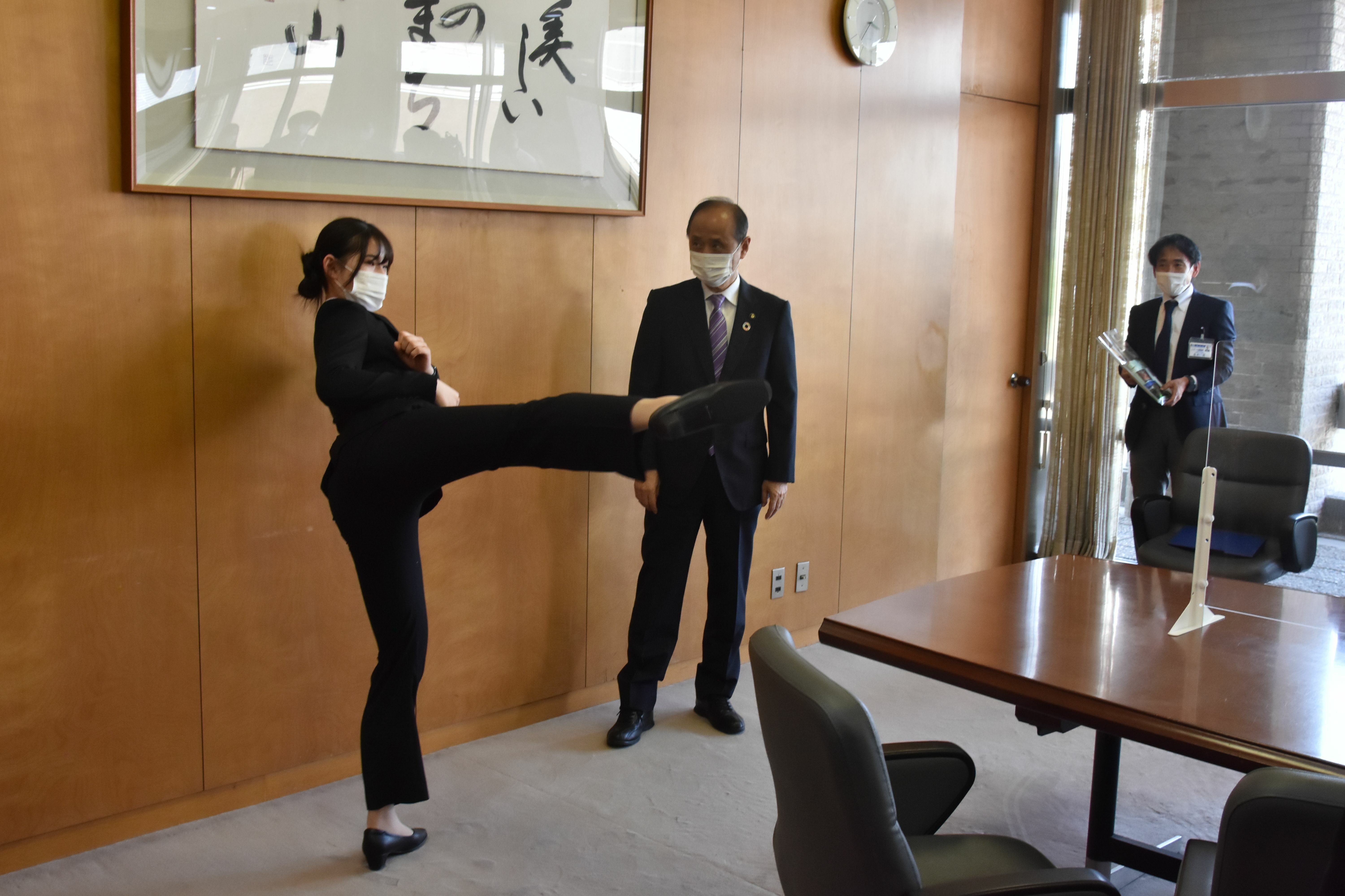 第14回全日本テコンドー選手権で見事優勝を飾った西田茉央さん(体育学科2年・就実高)が、大森雅夫 岡山市長を表敬訪問しました。