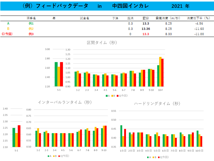 その第1弾は、陸上競技部が出場した中国四国インカレ(5/14~16・高知県立春野総合運動公園)のサポートでした。スポーツ科学センター研究員の明石啓太先生と仙波慎平先生が現地でレースと撮影と分析を担い、品田直宏監督にデータをフィードバックしました。女子100mハードルに出場した芝田愛花さん(体育学科3年)は、その予選後に品田監督とフィードバックされたデータを見て決勝に向けての修正箇所を確認。決勝では、目標としていた日本選手権の参加標準記録を突破し、見事、優勝を飾りました。まさに「科学で強くなるIPU」を体現した素晴らしいレースでした。