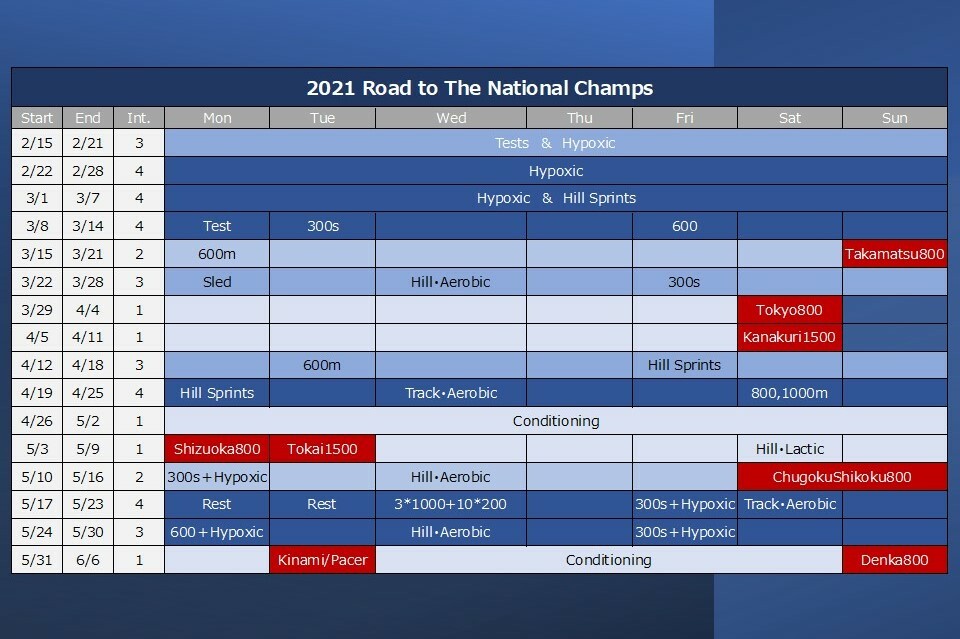 そこで、2019年の8月に行ったのが、3週間にわたって週2回の低酸素トレーニングを導入する取り組みでしたが、この取り組みは、日本インカレ1500mでの3名決勝進出、そして800mでの源君を含む2名の準決勝進出として実を結びました。この時の成功にならい、かつ、より顕著な効果を求めたのが今年の2月末から3月の1週目にかけての週3回、2週間(計6回)の低酸素トレーニングでした。トラックシーズン開幕を目前に控えたこの時期に、2週間にわたってトラックで高強度トレーニングを行わないことのリスクは前回の記事でご紹介しましたが、ここでの成功が今回の日本歴代5位の好記録に繋がりました。