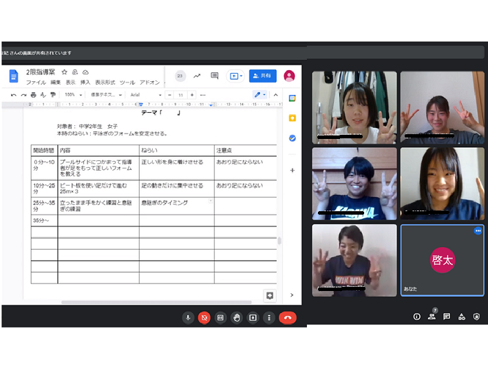 コロナ禍に見舞われた今年度の前期は実技授業のがストップした時期もありましたが、オンラインで「小中高でどんな水泳授業を受けてきたか」「泳いでいる時はどんなことを考えているか」などをディスカッションしたり、自分や他者の泳いでいる動画を見て分析したり、クロールや平泳ぎの技術的ポイントについての解説を聞いたり・・・様々な内容に取り組みました。その総仕上げとして、先日はグループごとに学習指導案の作成に挑みました。「授業の目標は何か?」「目標達成にはどんな内容が必要か?」「指導の際にはどんなことに注意するか?」などを話し合い、充実した指導案が完成しました。このような活動を通して学生からは「泳げない人がどれだけ水中で不安を感じているか知って驚いた」「指導内容を考えることでより深く水泳について考えることができた」などの感想が聞かれました。