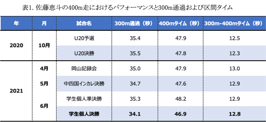 彼の担当コーチである梶谷亮輔コーチ(体育学科講師)は、400m選手のコーチングを行う際、選手のレース映像から各地点の通過タイムを分析し、トレーニング計画やレース戦略を決定しています。表1は、佐藤君の各レースにおける400mのタイムとその際の300m通過タイムを示しています。この表から、佐藤君のこれまでのレースでは300mを35秒前後で通過していることが分かります。