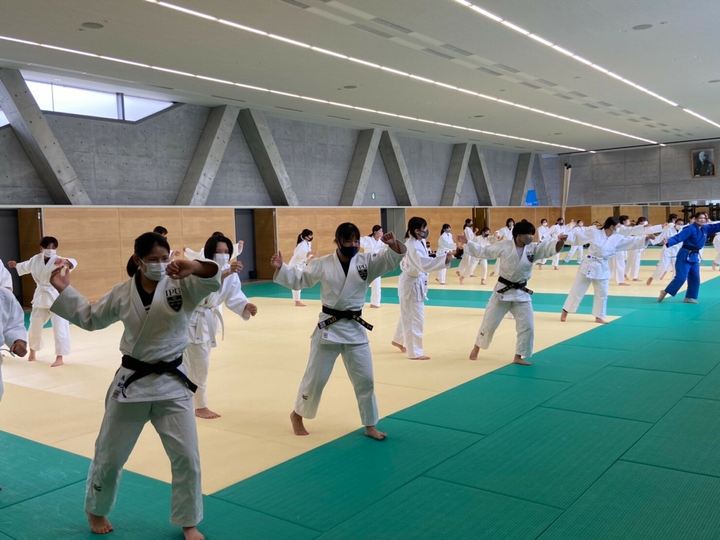 現在は、コロナ禍のため例年通りの授業内容ではなく、相手と組み合わない状態で向かい合い、息を合わせて動きを同時に行い、技の習得につなげると言った、新たな柔道の授業を展開しています。
