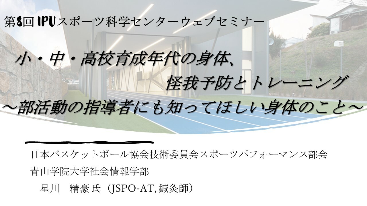 スポーツを安全・安心に、そして競技力を向上させるために必要とされるアスレティックトレーナー・S&Cコーチ・スポーツ指導者を目指す若手の育成を目的に、IPU・環太平洋大学のスポーツ科学センターでウェブセミナーを開催することとしました。スポーツの競技力向上・普及促進を図るために、IPUの学生だけでなく、テーマにご興味ある方・スポーツに携わる方にもご参加頂ければと思い、30名の定員を設けました。ぜひ、ご参加ください。