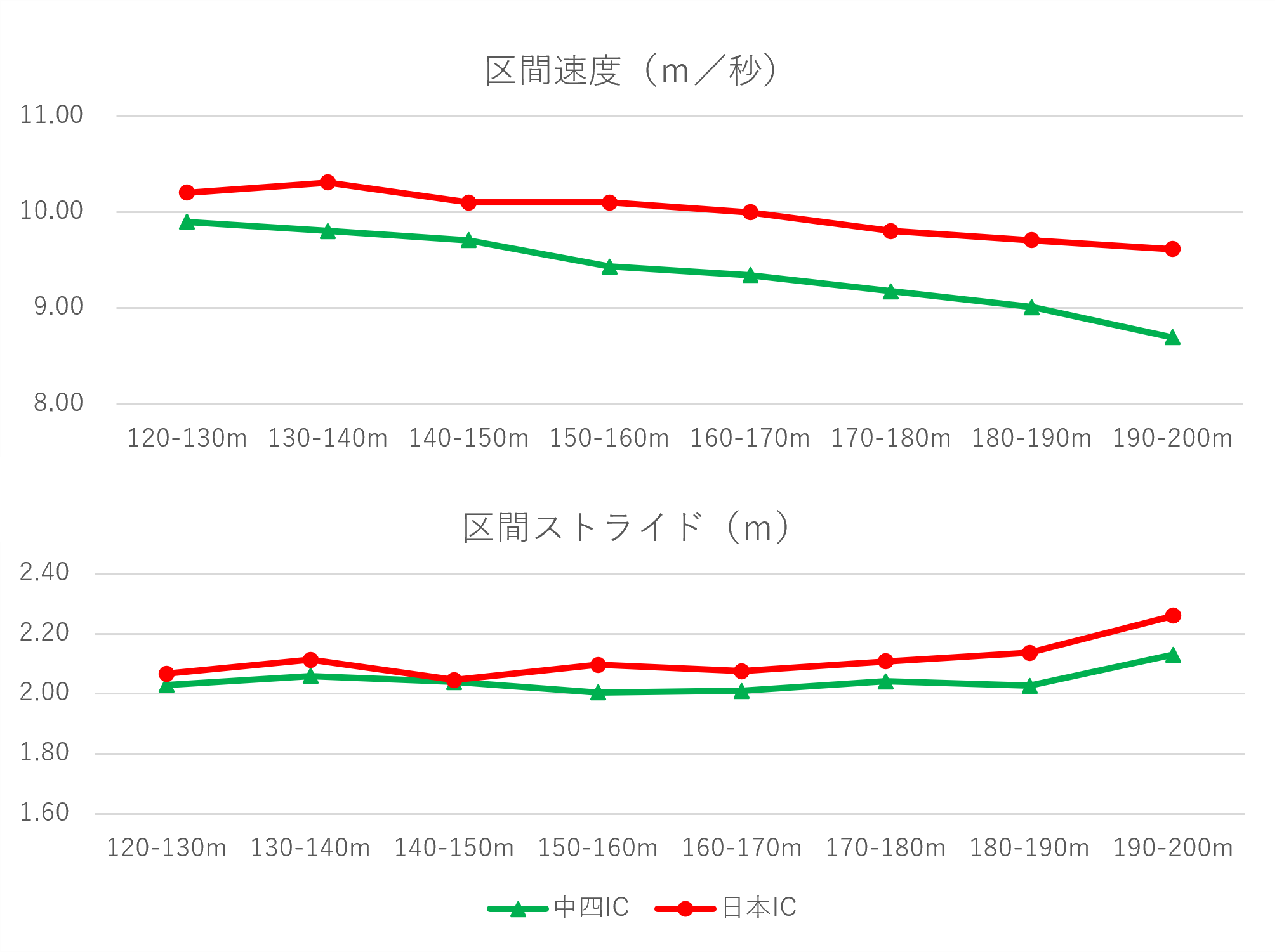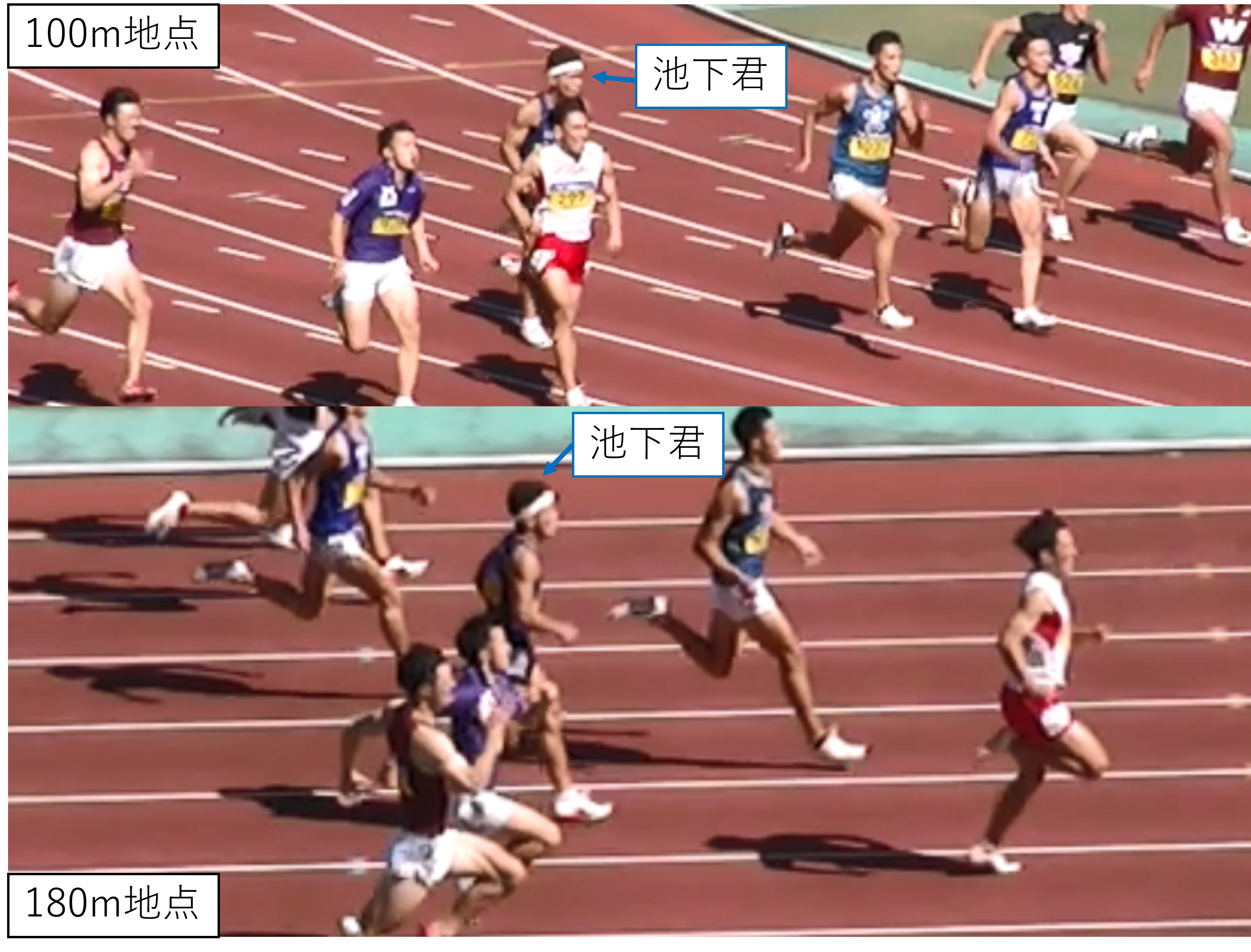 池下君の200m決勝は100m通過時点で8番手でしたが、180m通過時点で3位に上がる「後半型」の展開でした(写真左下)。後半80mを10mごとに区切った速度を見ると5月の中四国インカレ(中四IC)時より、今回の全日本インカレ(日本IC)のほうが減速が小さくなっていることが分かります。この要因として、ストライドを大きくできたことが挙げられます(写真右下)。池下君を担当する梶谷コーチ(体育学科教員)は「彼のレースはタイムのよい時ほど後半まで伸びのある走りを維持して減速が小さい傾向にあった。夏場にスピード強化に取り組んだ結果、ややストライドが短くなりタイムも思うように伸びなかったため、この大会に向けて後半のストライドを取り戻すためのトレーニングを積んだ成果が出た」とコメントしてくれました。成果を目に見える形で示すことで、実施したトレーニングの検証に役立ち、今後の競技人生・指導者人生がよりよいものになることを期待しています。