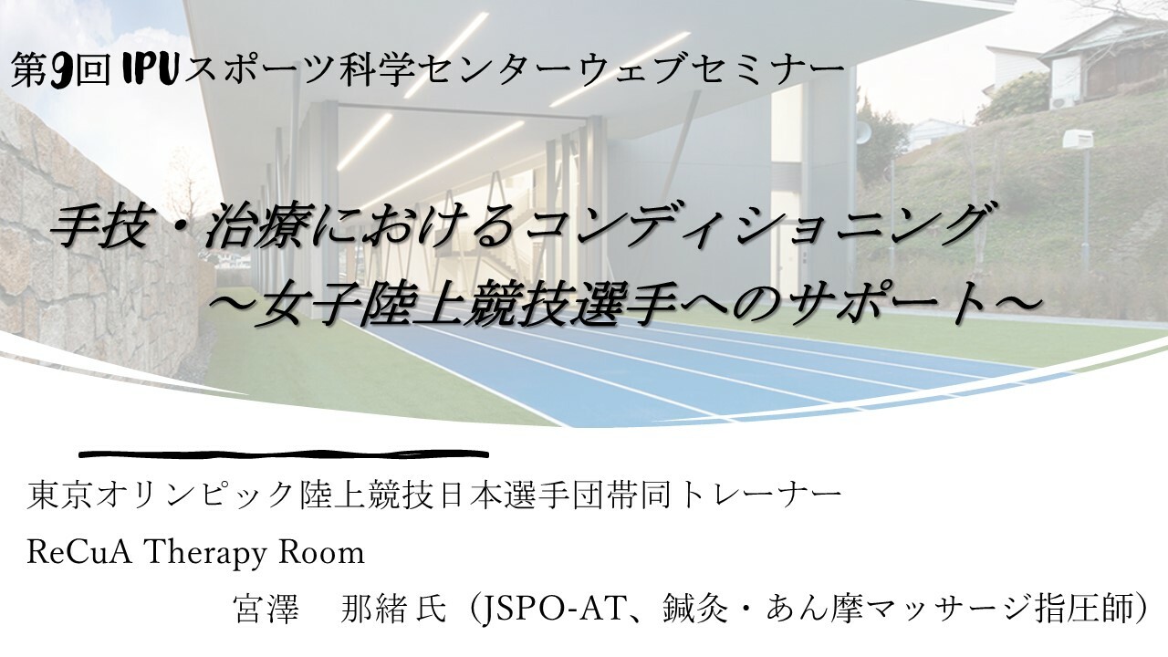 スポーツを安全・安心に、そして競技力を向上させるために必要とされるアスレティックトレーナー・S&Cコーチ・スポーツ指導者を目指す若手の育成を目的に、IPU・環太平洋大学のスポーツ科学センターでウェブセミナーを開催することとしました。スポーツの競技力向上・普及促進を図るために、IPUの学生だけでなく、テーマにご興味ある方・スポーツに携わる方にもご参加頂ければと思い、30名の定員を設けました。ぜひ、ご参加ください。