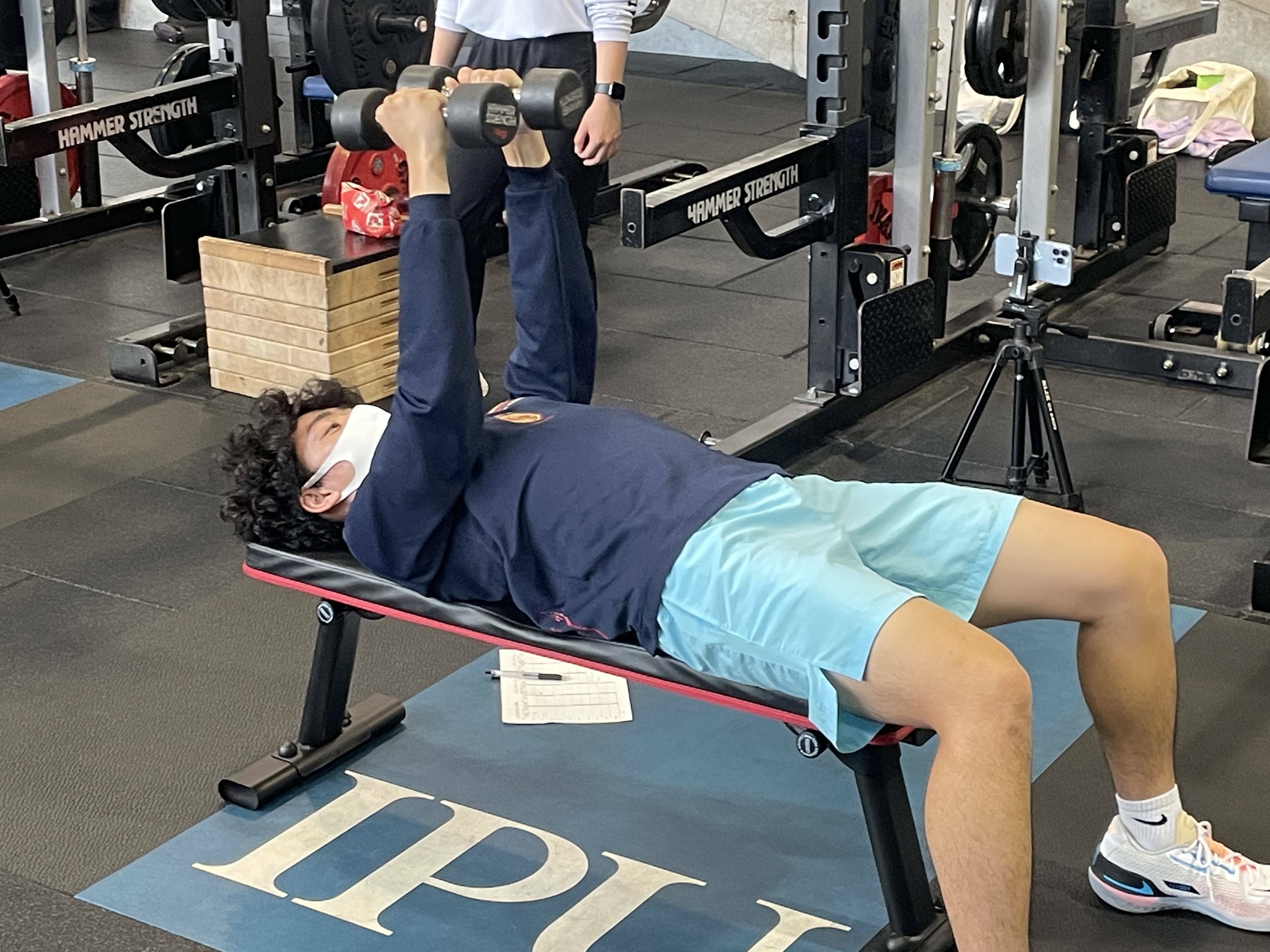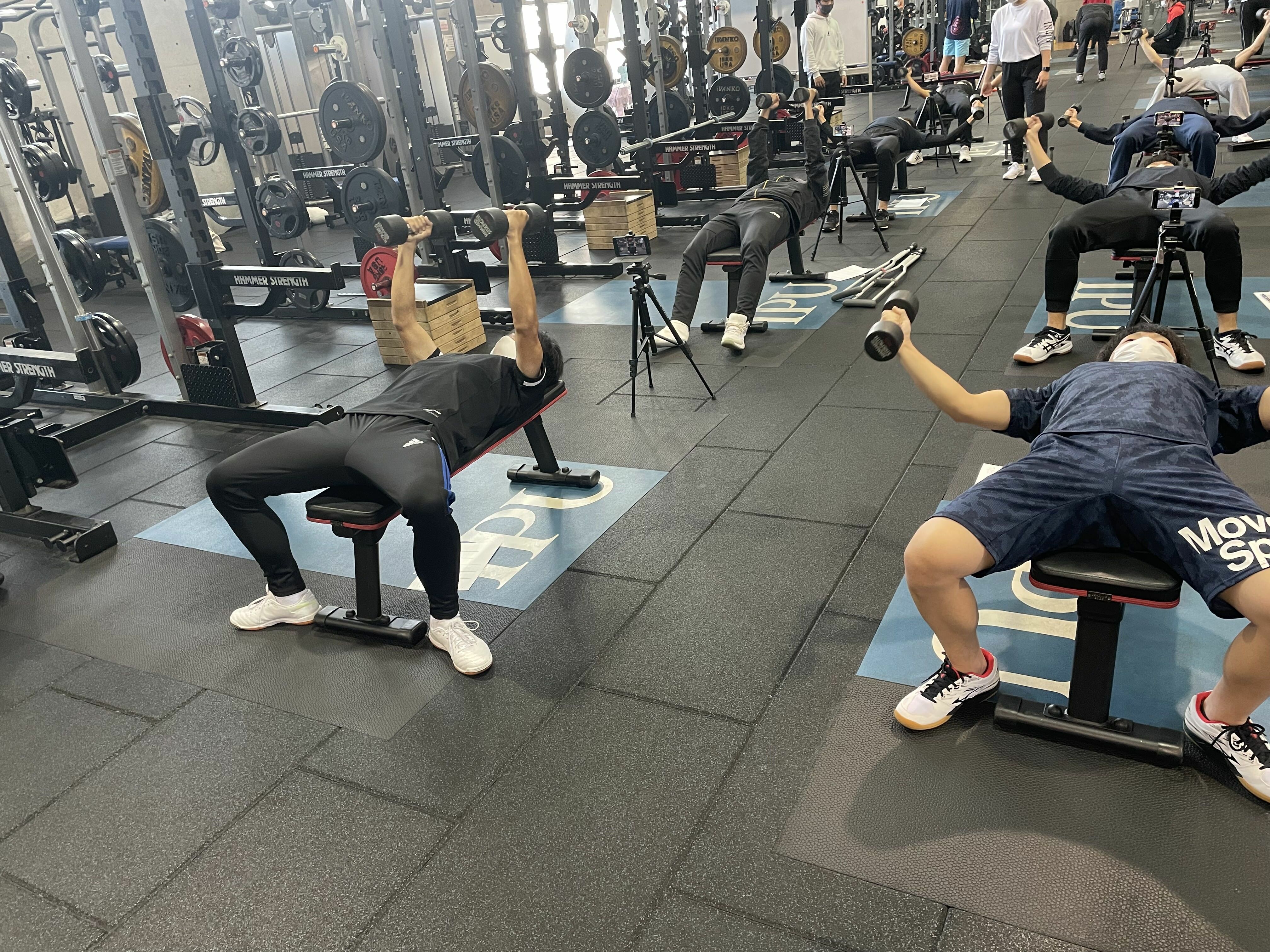 トップガントレーニングセンターのトレーニング機器をフル活用しながら、スクワット、デッドリフト、ベンチプレスなどの種目を学び、その成長を測るためにも筋力測定なども行っています。