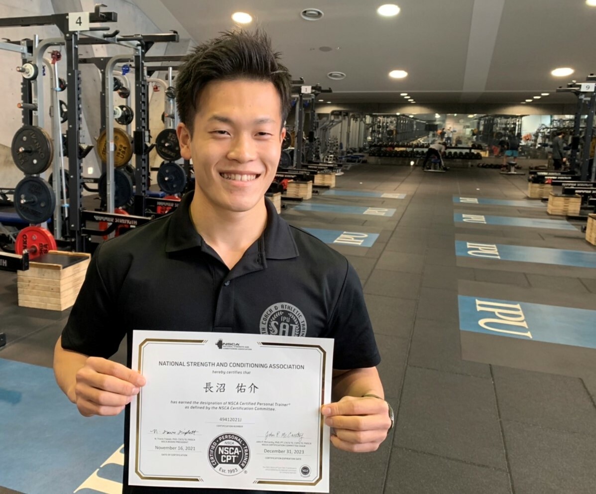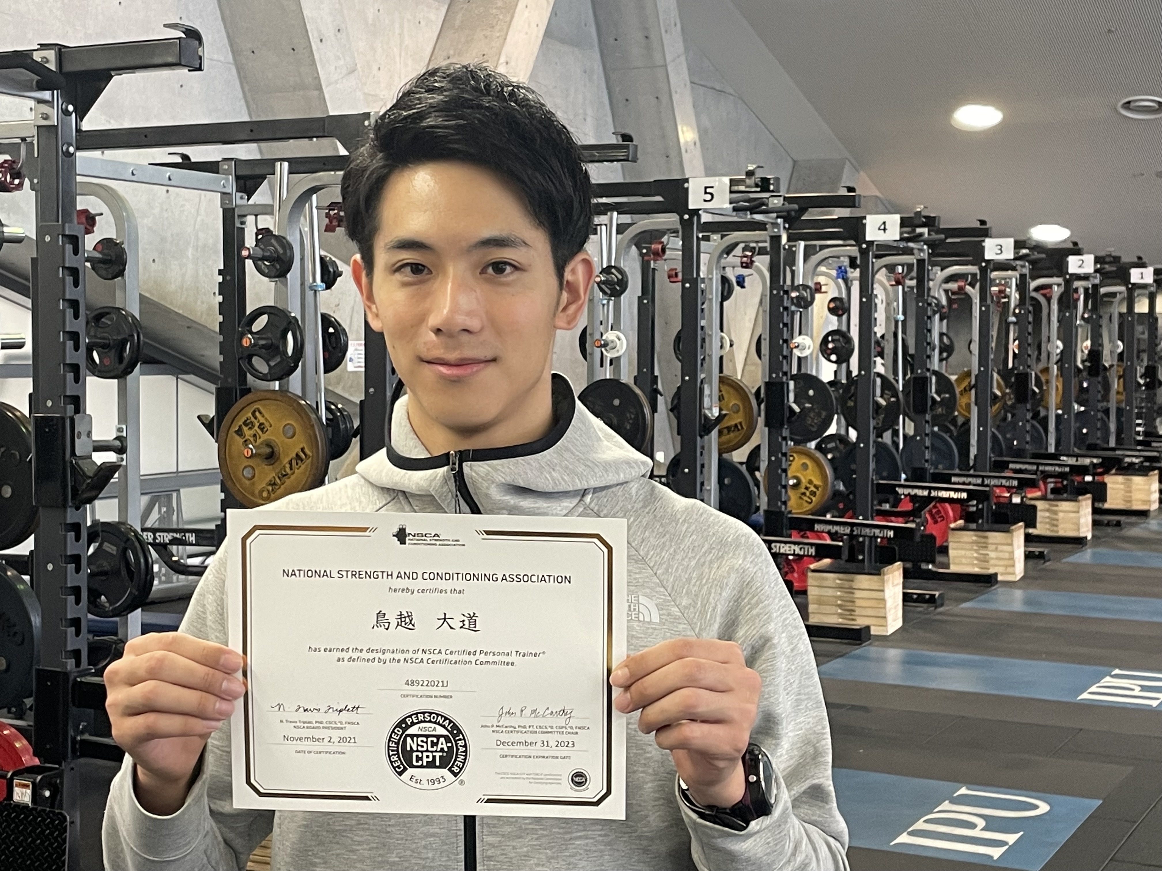 「トレーニング指導をするなら、トレーニングができるだけでは良くないと思い、CPT取得を目指しました。トレーニング演習の授業はもちろんのこと、普段から先生方にトレーニングやコンディショニングに関する考え方やアドバイスを頂いたことによってCPT取得に向けた勉強もイメージしながら進めていく事ができました。これからも自己研鑽のために先生方をどんどん利用させていただきます。笑」(鳥越君)