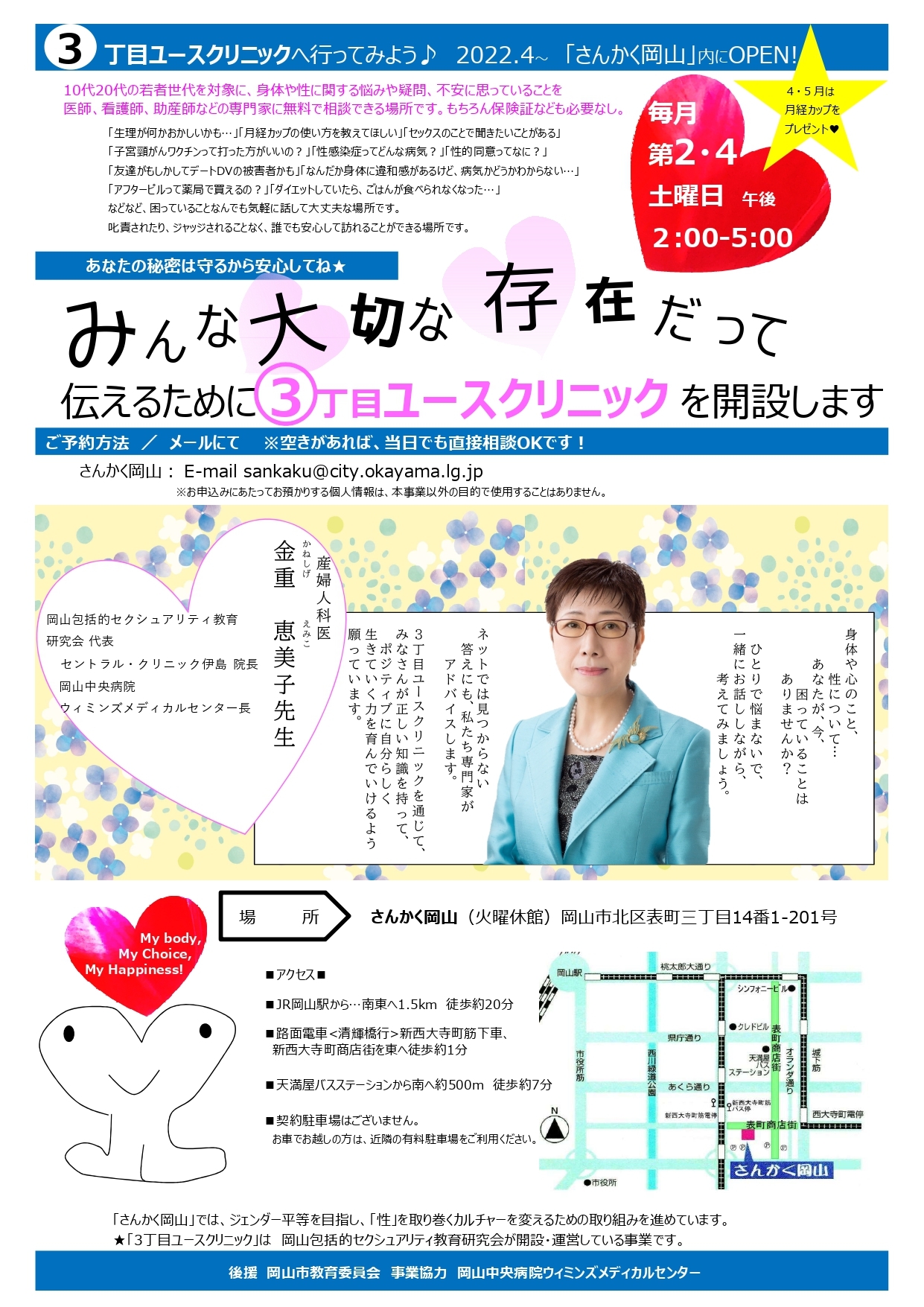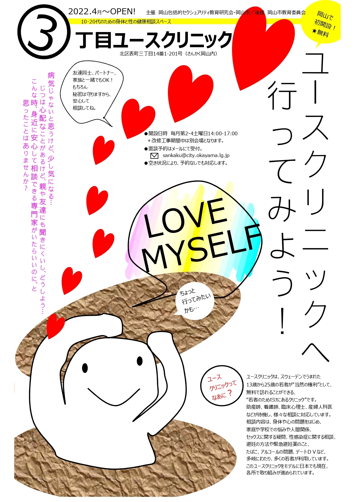 10~20代の若者の身体や性に関する悩みや疑問等を、医師や看護師などの専門家らに無料で相談できる「3丁目ユースクリニック」が、さんかく岡山(岡山市北区表町)に開設されました。