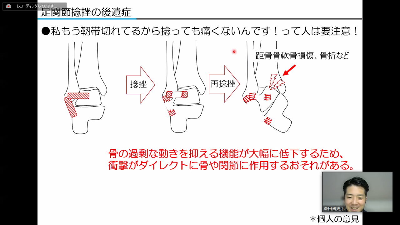 講師には、これまでスポーツ現場でトレーナーをされつつ、足関節捻挫の研究論文を執筆されている峯田晋史郎氏をお招きしました。