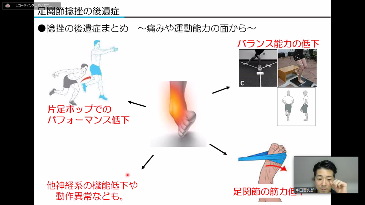 講演テーマは「足関節捻挫の"後遺症"とアスレティックリハビリテーション -最新研究データの活用の仕方-」と題して、