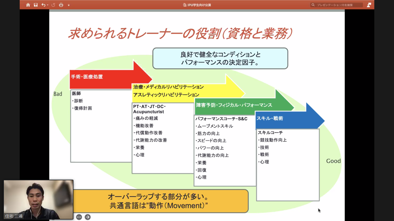 ”トレーナーの役割が今はとても重要なのだということが今回の講話を通して分かりました。その役割のなかで、以前より早い段階でのサポートや補助をしているということも分かりました。そして、足関節など硬いかということより、動き方を理解しているかということにも重点を置くことも大切ということが一番興味深く自身のためになりました”