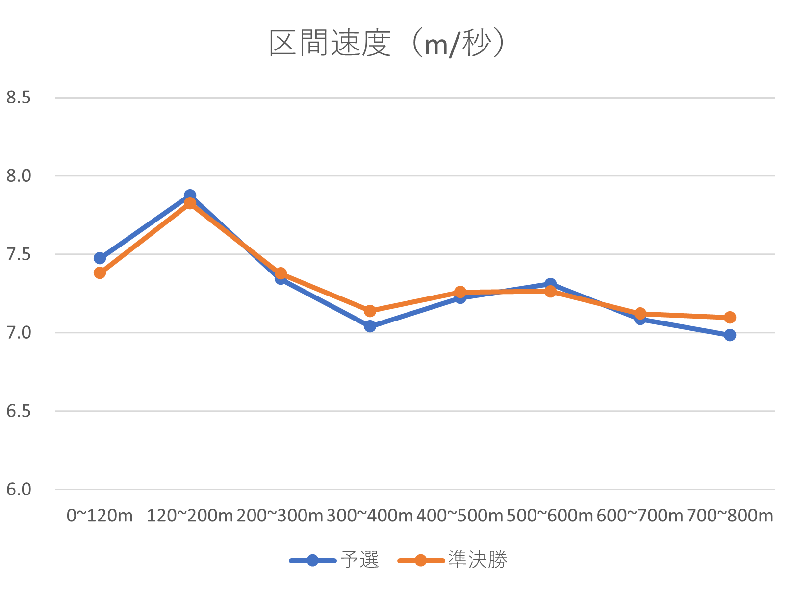 予選を組2着で終え、順調に準決勝へ進出した前田選手でしたが、準決勝は強豪選手がひしめく厳しい組に入ってしまいました。この組を勝ち抜くために吉岡利貢コーチから「優勝経験のある2名に真っ向勝負を挑むのも面白いがリスクは高い。序盤から前に出て自分のペースを貫くことができれば決勝進出は決して難しいことではない」とアドバイスを受け、その通りに前半から先頭に躍り出る積極的なレースを展開しました(写真左)。終盤で3名の選手に逆転されたものの、1分50秒を切る好タイムで総合8位に滑り込み、この種目で1年生唯一の決勝進出を果たしました。100mごとの速度変化を見ると予選と準決勝でほぼ同様であることが分かります(写真右)。初めてのインカレで委縮する選手も多い中、吉岡コーチのアドバイス通りに自分のレースを貫いた前田選手の思い切りの良さが光るレースでした。