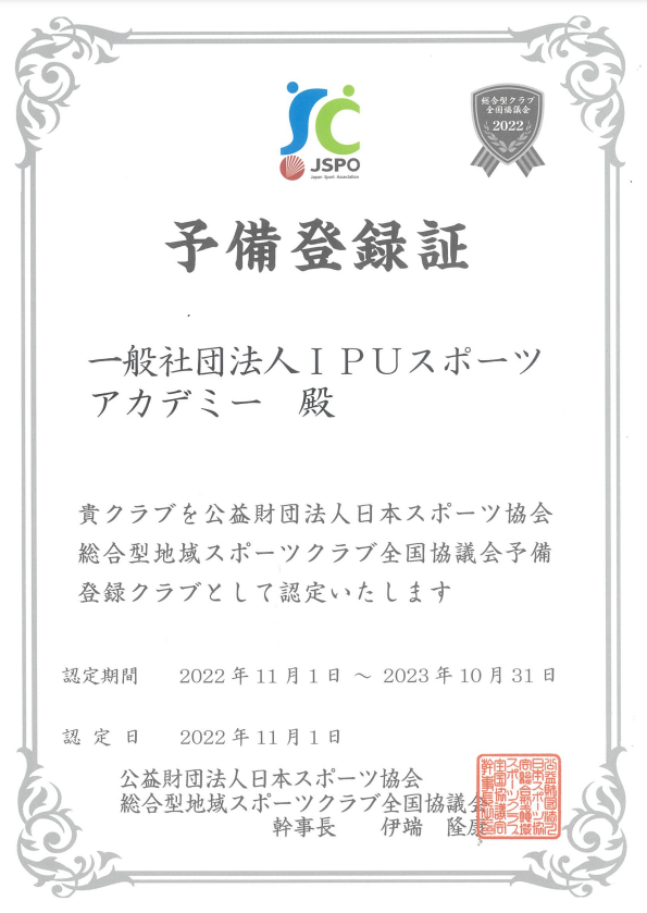 このたび一般社団法人IPUスポーツアカデミーは、(公財)岡山県スポーツ協会を介して、国より総合型地域スポーツクラブとしての認証を受けました。今年度より総合型地域スポーツクラブの体制が始まり、県内総合型地域スポーツクラブも全国クラブ、県スポーツ協会公認クラブ、認知クラブと3パターンのクラブ体制へと変更になりました。