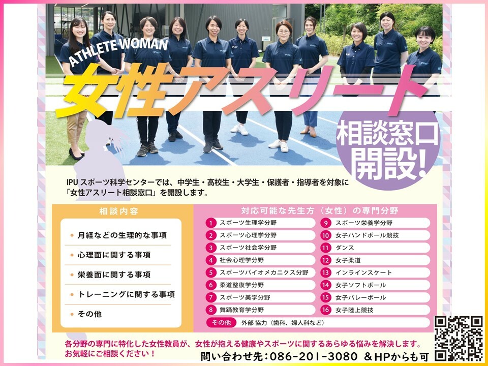 本学では、女子学生が女性特有の健康問題に対して大きな不安や困難なく、安心して大学生活を送ることができるよう、現在のみならず将来を見据えた健康教育を行うことを目標に、女性アスリート(女子学生)支援プロジェクトや女性アスリート相談窓口を開設しています。