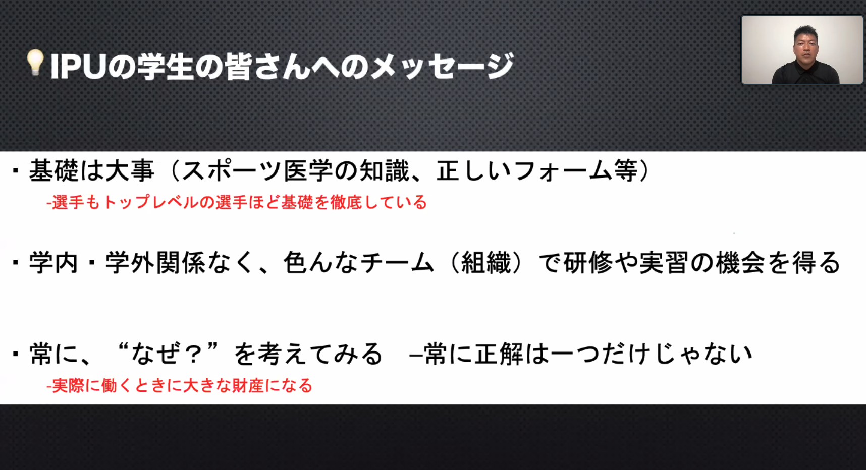 先月末の講演にひき続き、7月19日(水)にトレーニング指導者(S&C)育成プロジェクトの一環として、「第17回IPUスポーツ科学センターウェブセミナー」を開催しました。