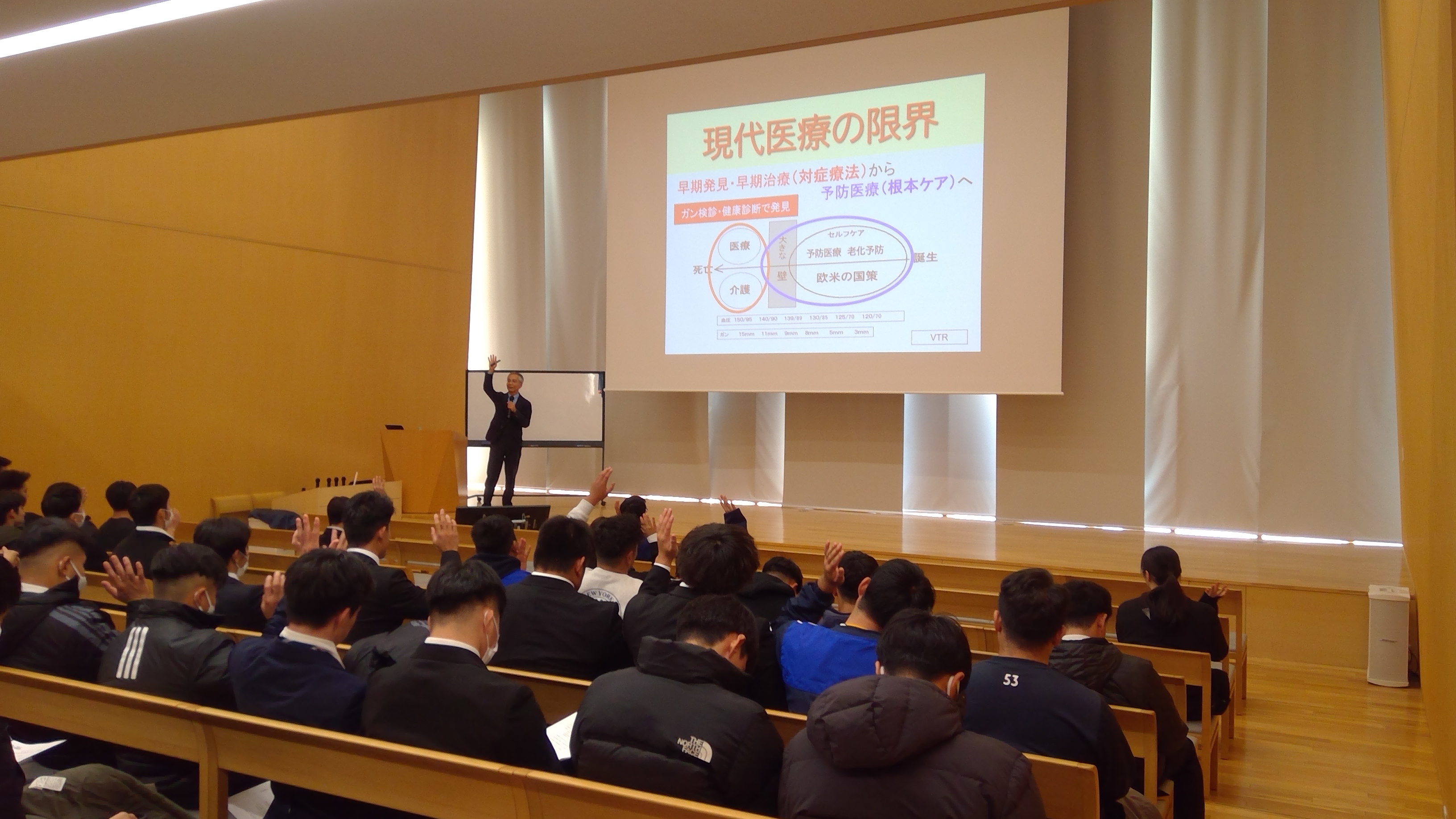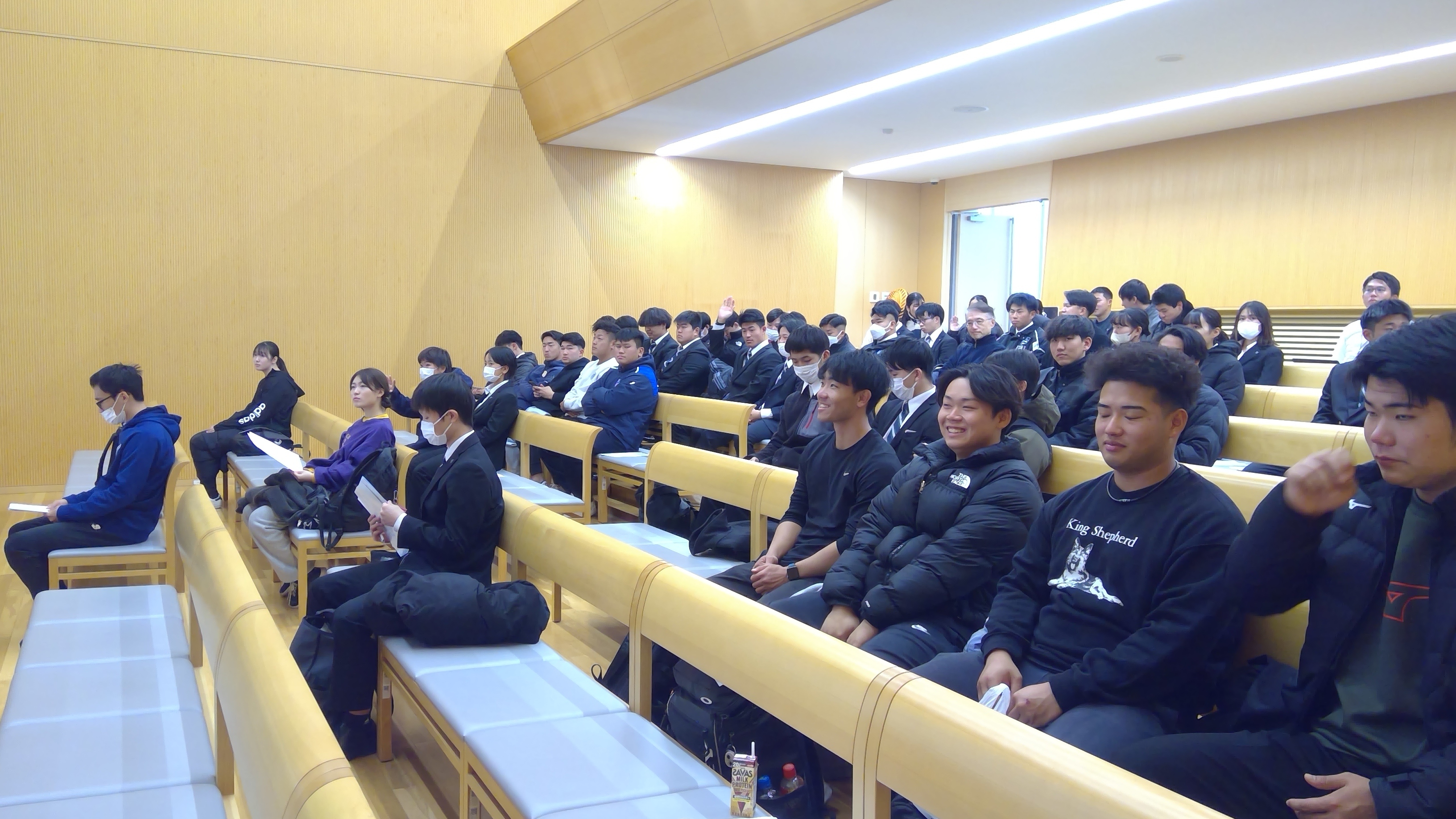 今回の講演では、 スポーツ選手は、パフォーマンスを上げるとともに、ヒトとしての健康管理(60兆個の細胞のケア)が大切であること、カラダの元気はこれから先の長い人生を元気に送るためにとても重要であることを分かりやすくお話いただき、これらを簡単に実現できる方法をご教示いただきました。金城先生には、講演後も学生からの質問に、丁寧にご返答いただきました。
