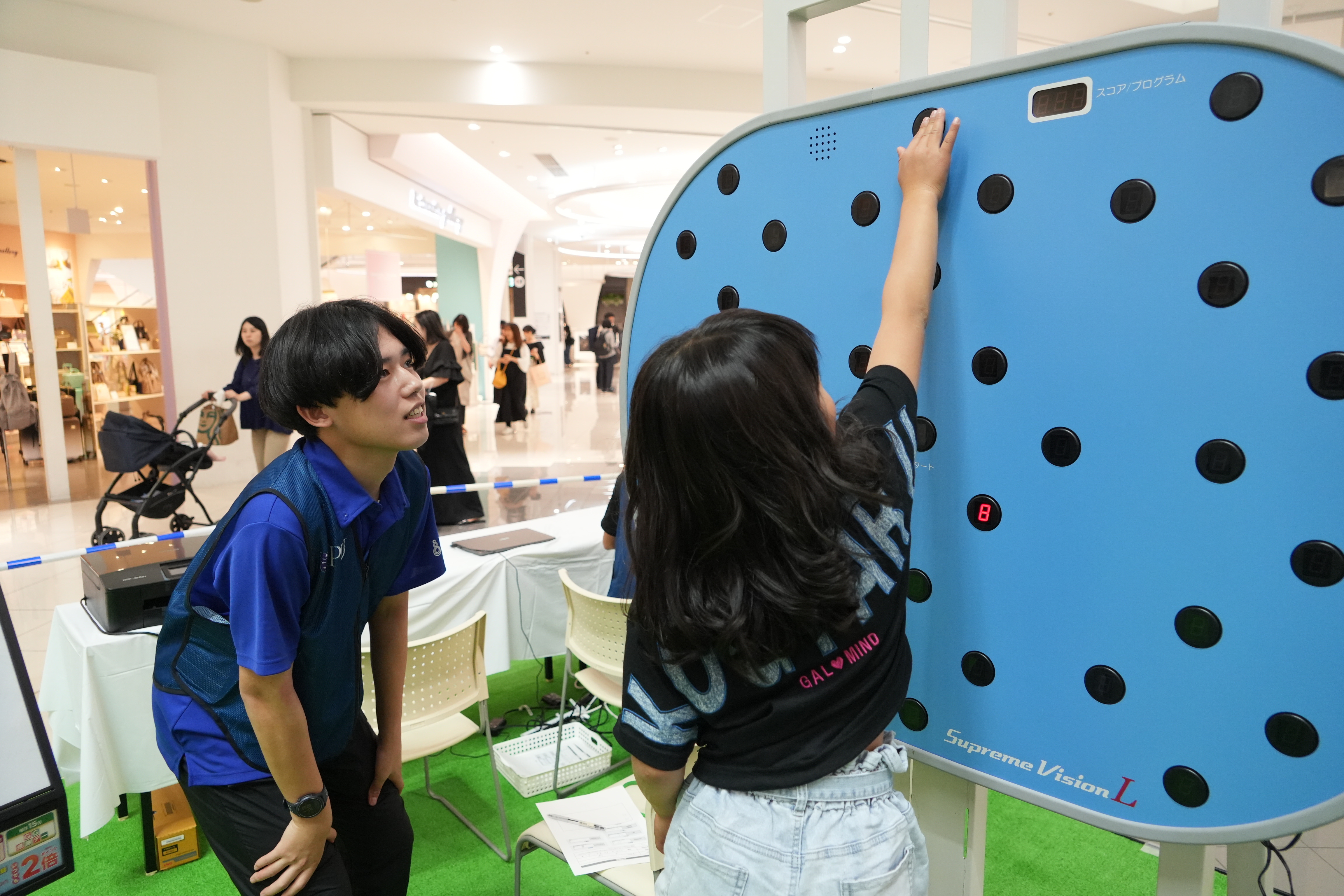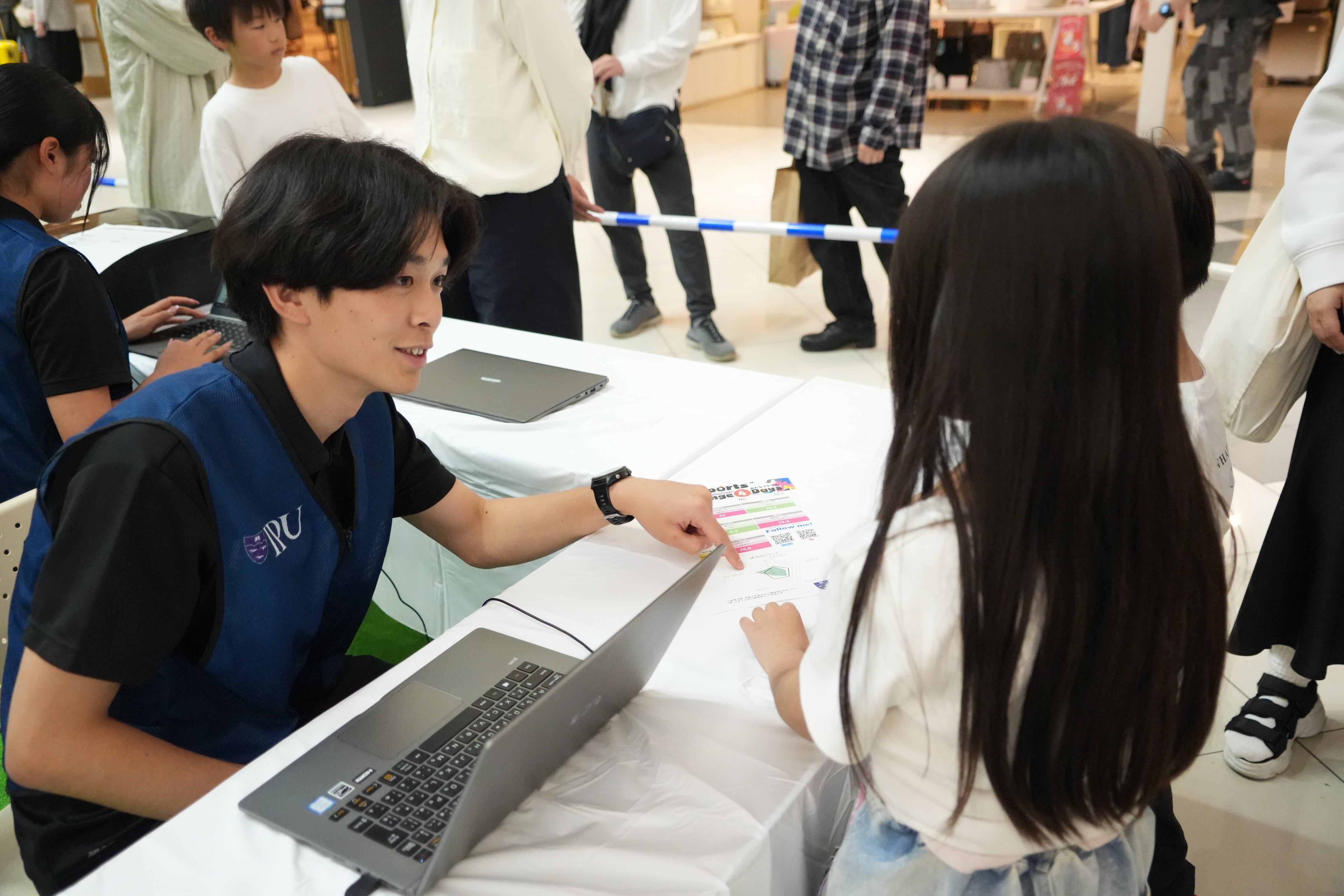 本イベントは、株式会社ビザビ様のご依頼のもと実施されたもので、子どもから高齢者まで幅広い年齢層の皆様が来場。会場では、体育学部を中心に、次世代教育学部、経済経営学部の学生たちが連携し、5種類の体力測定(握力、垂直跳び、反復横跳びなど)を実施。測定結果はその場でフィードバックされ、参加者の皆様は笑顔でデータを持ち帰られていました。