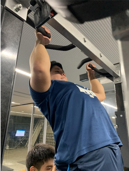 トレーニングでは、筋肥大、筋パワーの強化、筋持久力の増加等の効果が上げられるので、日々頑張ってトレーニングしています。より一層トレーニングの質を部員全員で高めていきたいと考えています。