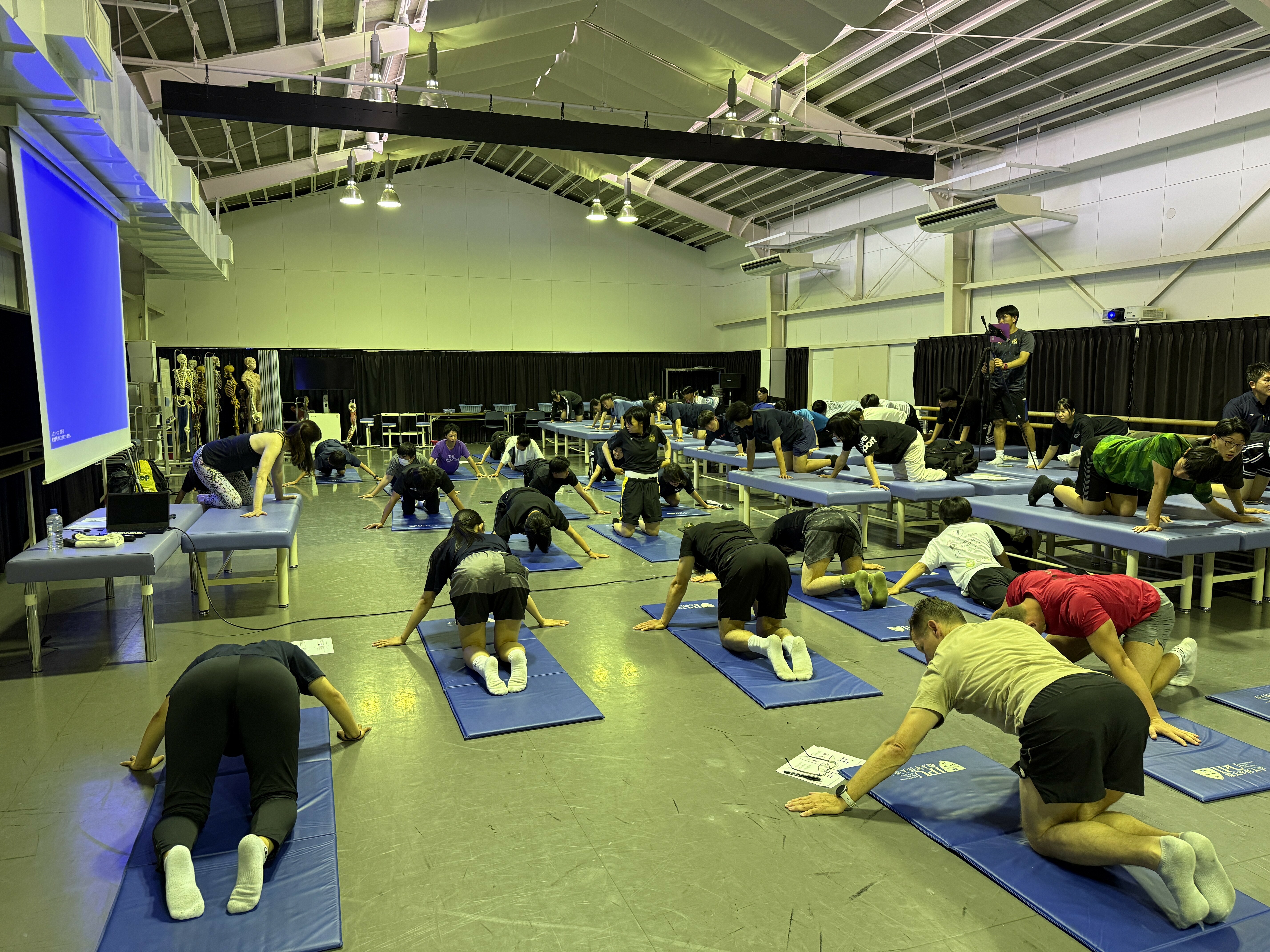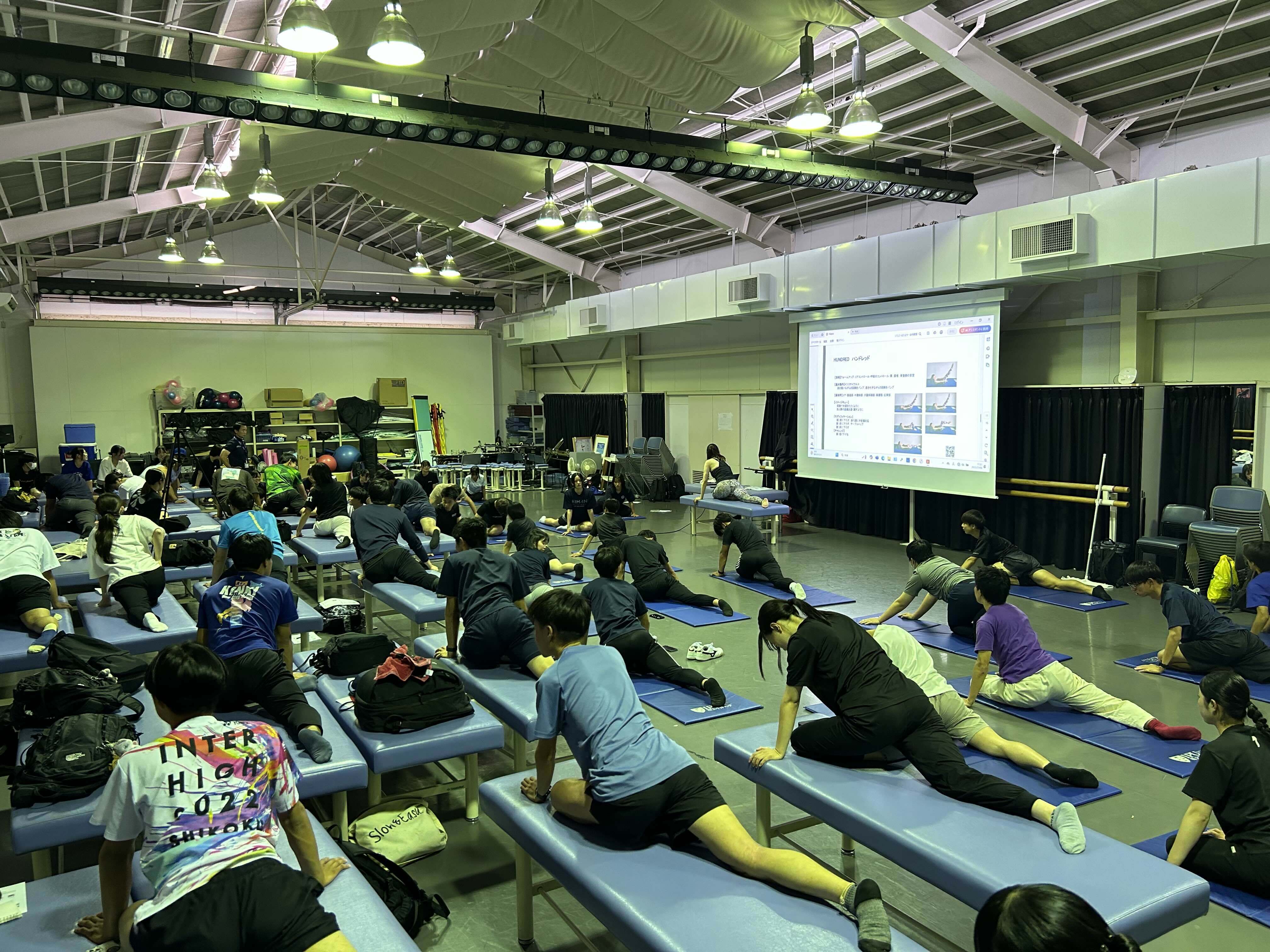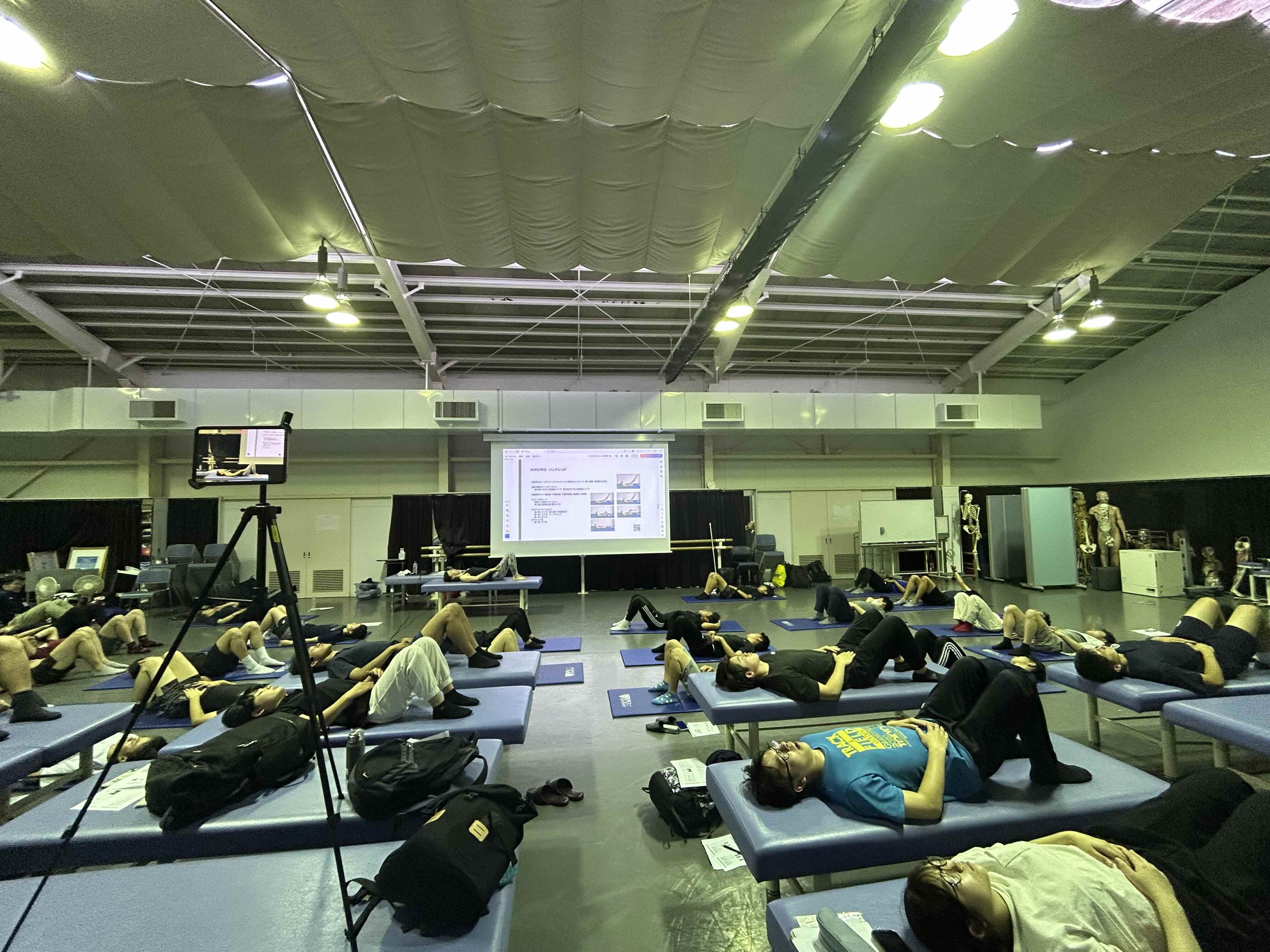 ピラティスについては、歴史から解剖学的な知識の説明に加え、実際に基本的なエクササイズを体験しながら学びました。日本では「女性が行うエクササイズ」というイメージが強いものの、近年ではプロスポーツ選手なども取り入れており、トップアスリートから一般の方々まで幅広く普及しています。姿勢改善、腰痛予防、インナーマッスルの強化、体幹の安定性など、日常生活からスポーツパフォーマンスの向上まで多様な効果が期待できるピラティスを実践し、その効果を実感することができました。また、ピラティス特有のキューイング(指示の出し方)も数多く紹介され、とても学びの多い有意義な時間となりました。