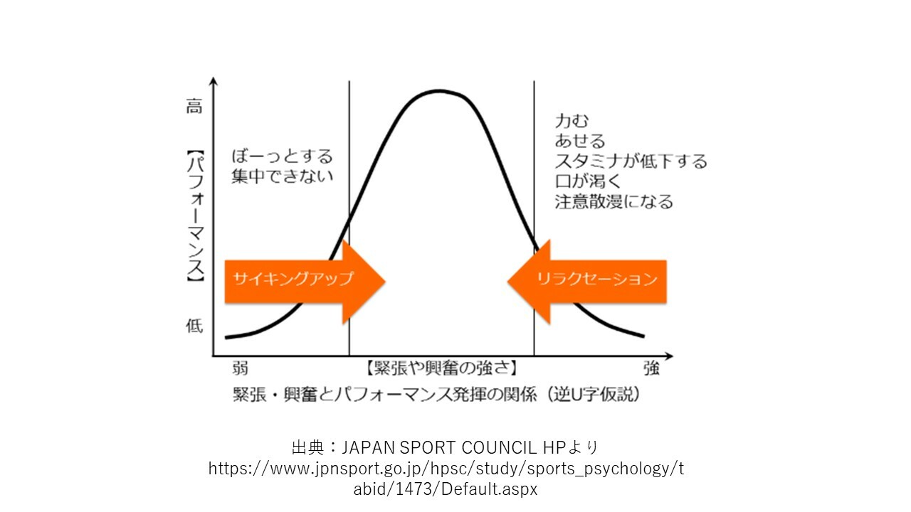 緊張や興奮の強さが高すぎても低すぎてもパフォーマンスは低下します(逆U字仮説)。