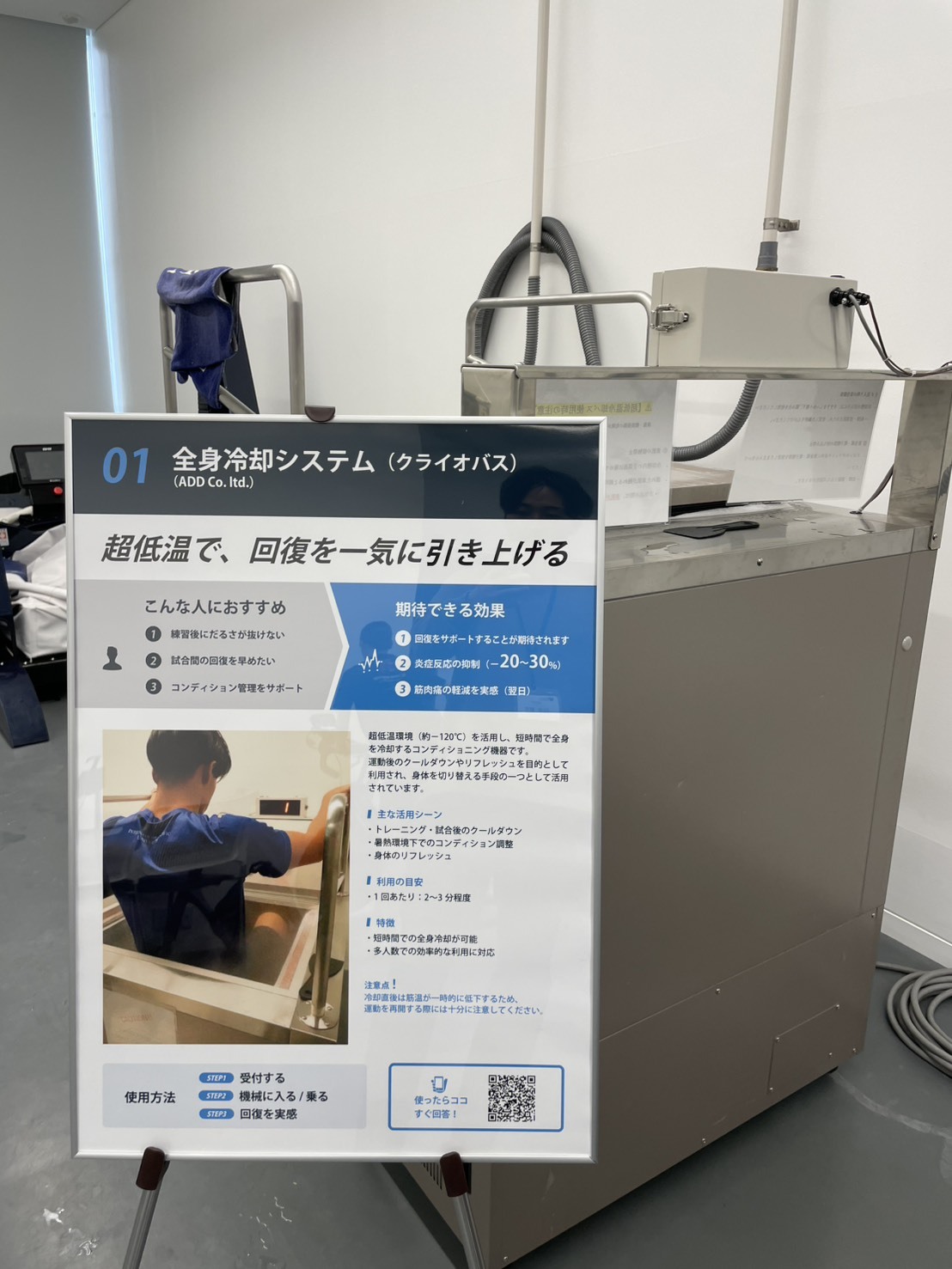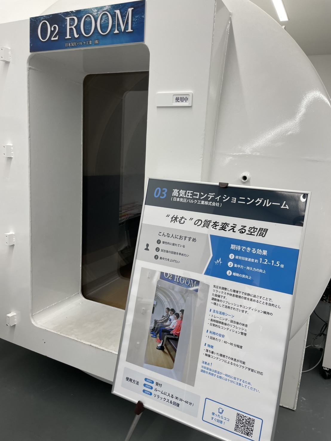 クライオバス(超低温刺激)、皮膚機能のコンディショニング機器、高気圧環境装置(酸素ルーム)、免荷式トレッドミル、さらに気圧・気温・酸素濃度を制御可能な環境制御室の常設により、スポーツ科学センター内の環境適応科学による統合型コンディショニング実践拠点を強化しました。